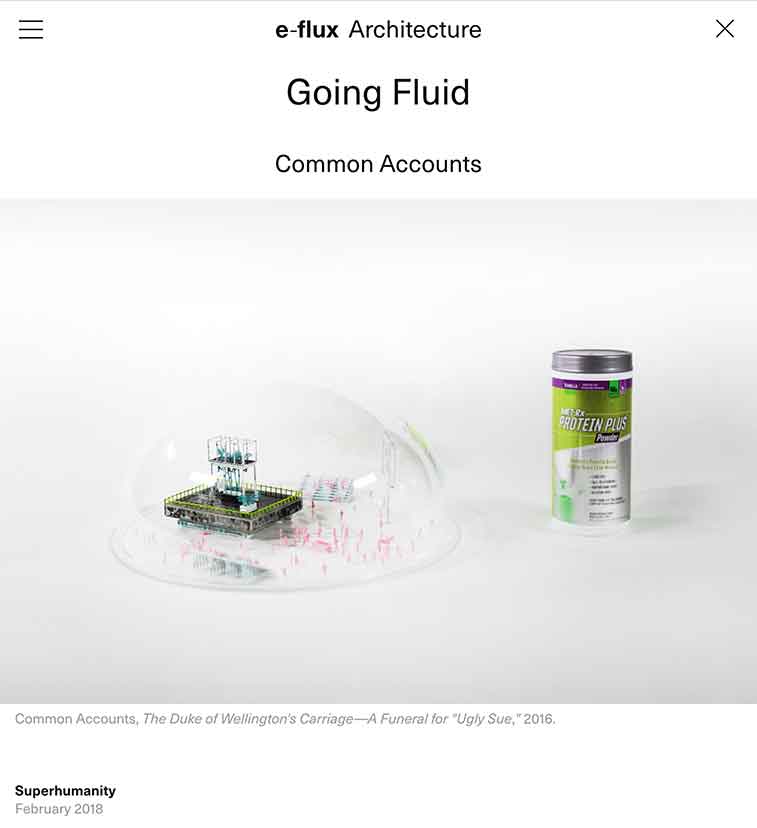 Recently published work from Common Accounts includes a series of speculative parade floats for Yale’s Perspecta 54: Atopia (2021), an essay on the possibilities of putridity in Fulfilled (edited by Ashley Bigham, Applied Research and Design, 2021), a text on the world’s most active plastic surgery district in Superhumanity: Post-Labor, Psychopathology, Plasticity (edited by Nick Axel, Beatriz Colomina, Nikolaus Hirsch, and Jihoi Lee, 2018), and a proposal for the future of death in Imminent Commons: The Expanded City (edited by Alejandro Zaera-Polo and Hyungmin Pai, 2017).