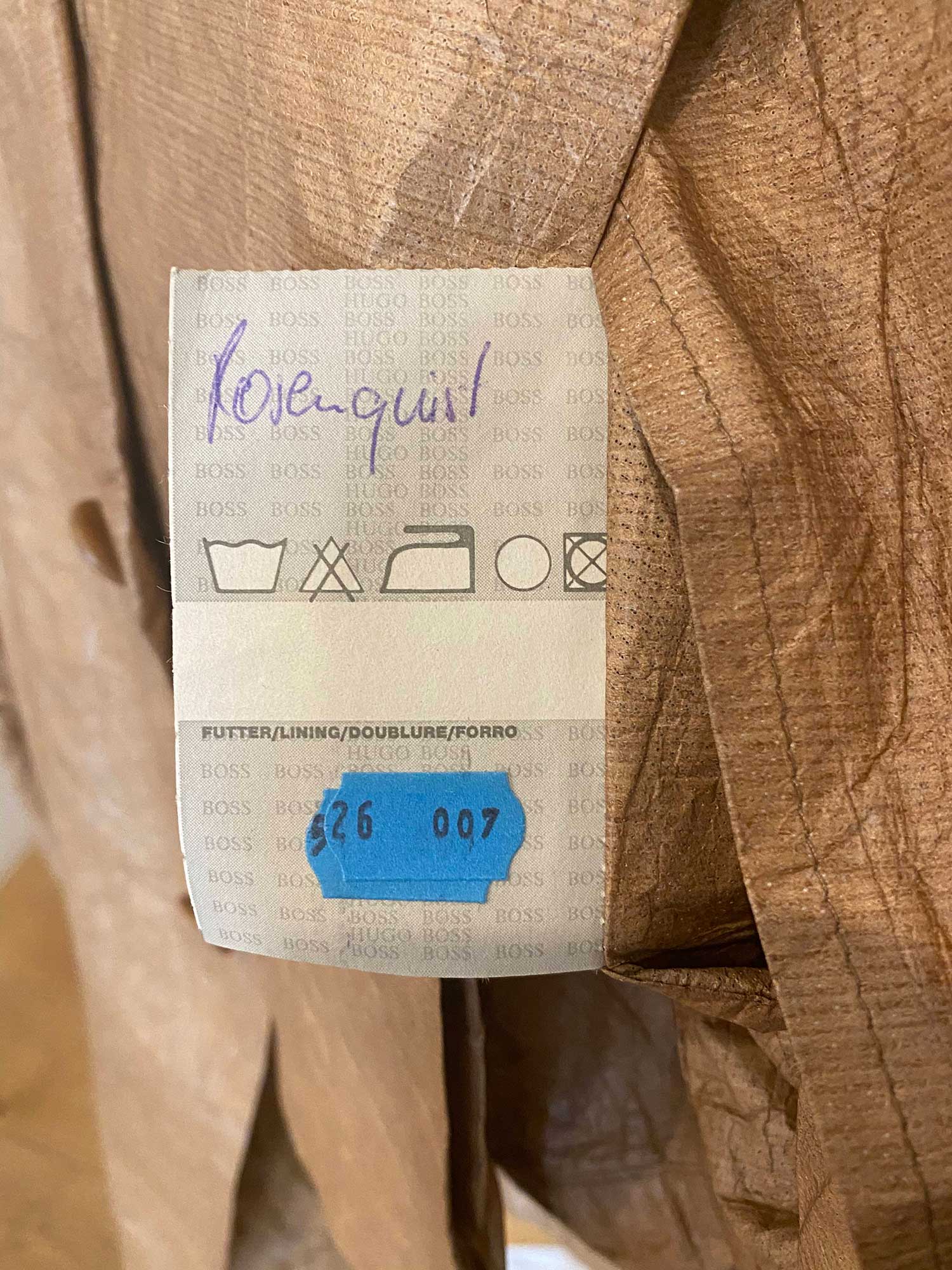 SARAH BANCROFT—The first suit Jim had made for him in 1966 using paper from the Kleenex company, and it was brown paper, and I actually think it was like pattern-making paper, stiff, so after wearing it several times he could definitely fold it, it became pliable. And the second suit that Mimi is talking about was made in 1998 by Hugo Boss, on the occasion of the Rosenquist ‘The Swimmer in the Econo-mist’ exhibition at the Deutsche Guggenheim Berlin, and it was a wonderful re-imagining of the suit, but as Mimi said it was Tyvek, which is the same material that a FedEx envelope is made of and is kind of indestructible. I think it’s used in construction, too, as siding to waterproof houses…