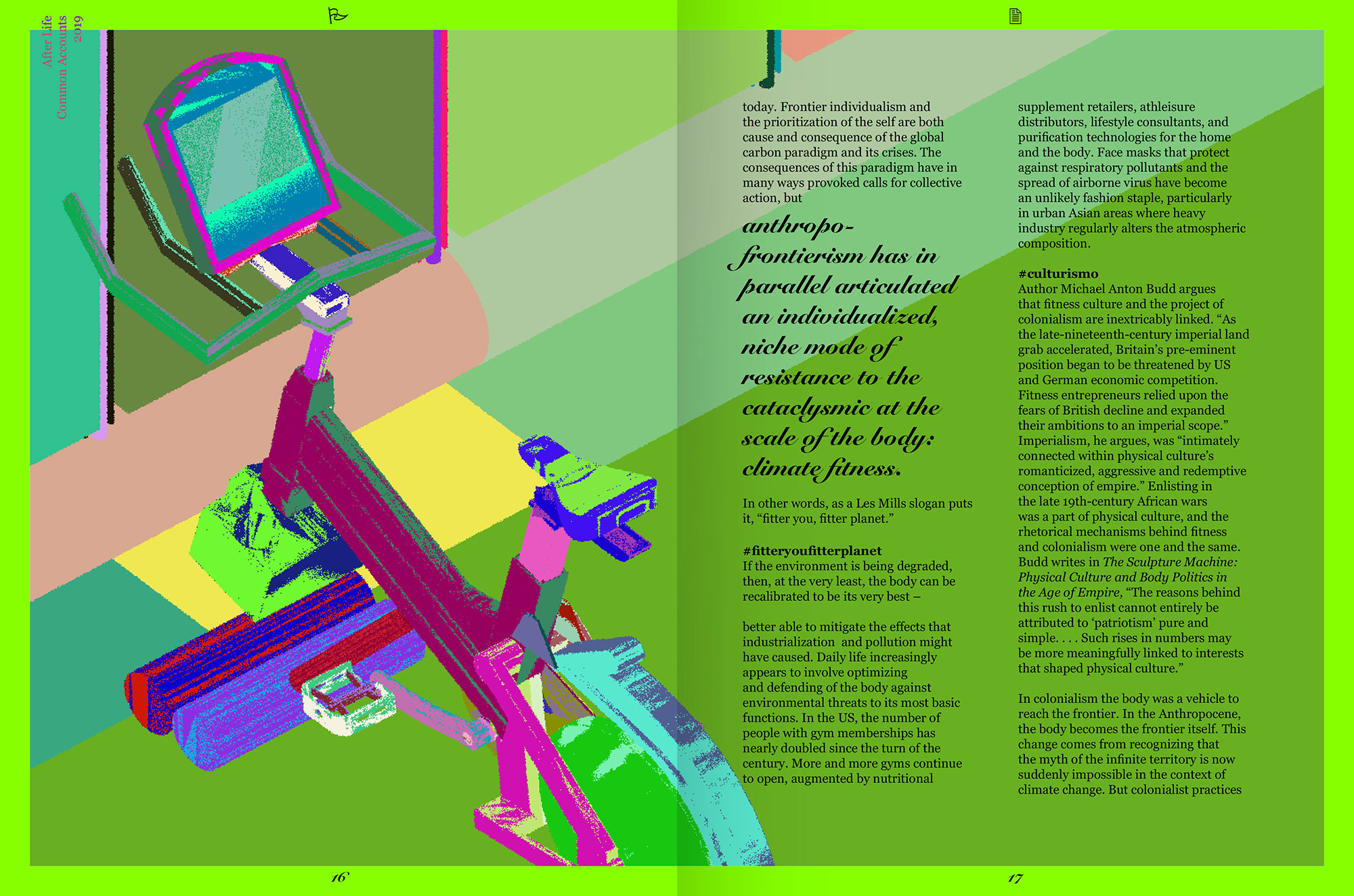 #newfrontiers. If the Anthropocene represents an existential threat, then it is somewhat paradoxical that, faced with the possibility of humankind’s demise, the individual body is more present than ever. A focus on the body that prioritizes individual performance and status seems out of place at a moment when the entirety of humanity is under threat. In cultural discourse, politics, and the popular imaginary, human anatomy is more visible and available as a subject for modification, regulation, and design than ever before. From the surgeon’s clinic to Facetune, through gut health and biohacking, and from the bedroom to Equinox, the body is under nearconstant scrutiny in the search for new sites of value—be it social, material, or otherwise.